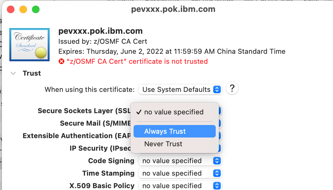 • Double click on the certificate. Expand the “Trust” section, modify the “Secure Sockets Layer (SSL)” options, make it “Always Trust”.