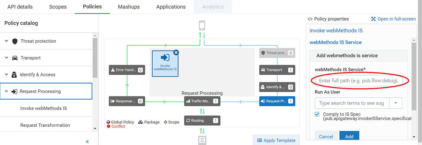 Now if I want to invoke service:firstService in API Gateway… what do I insert into the webMethods IS Service (in Policies > Request/Response Transforming > Invoke webMethods IS, and in terms of secondService, I’d like the input to be taken from what was submitted from the user that made the request, like a JSON string), and what do I pick for ‘Run As User’?