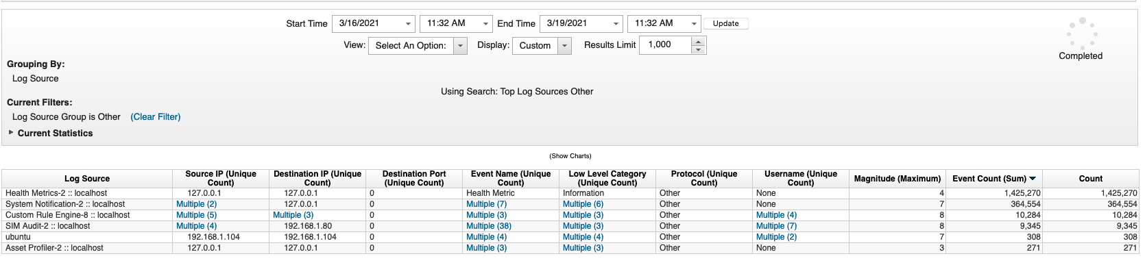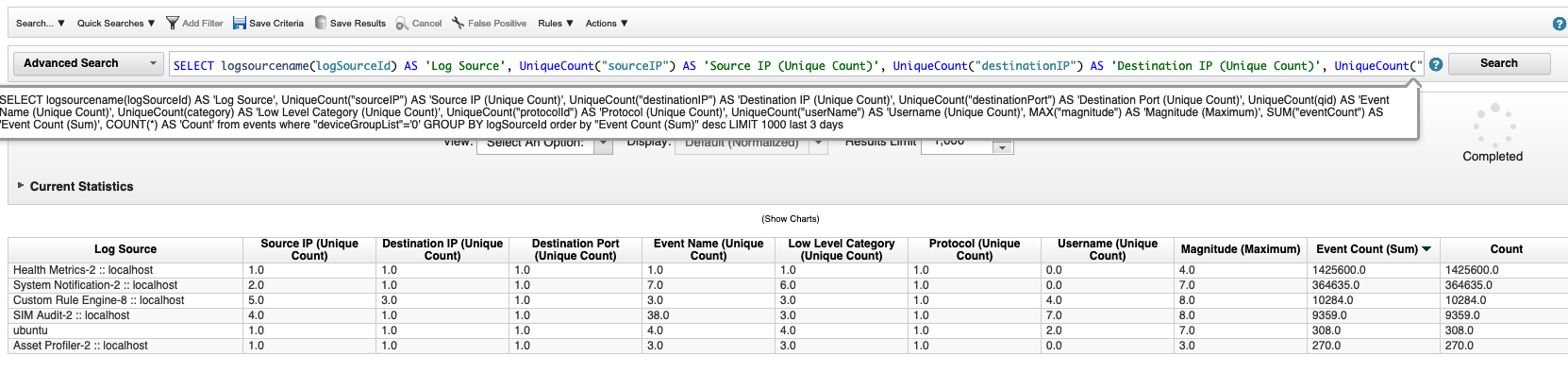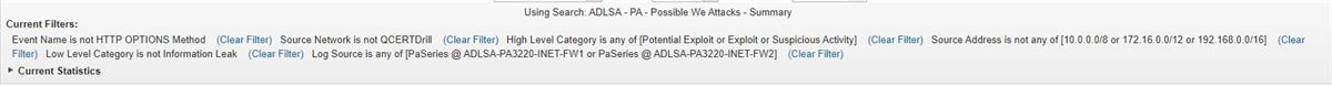 select "sourceIP" as 'Source IP',QIDNAME(qid) as 'Event Name',"adlsa-pa-action" as 'adlsa-pa-action (custom)',"destinationIP" as 'Destination IP',"destinationPort" as 'Destination Port',"Application" as 'Application (custom)',"startTime" as 'Start Time' from events where ( ( ( ( ( category != '7024' AND (logSourceId='2316') or (logSourceId='2317') ) AND ((category - category % 1000)='5000') or ((category - category % 1000)='7000') or ((category - category % 1000)='13000') ) AND qid != '53502999' ) AND (FULLNETWORKNAME(SourceIP, DomainID)<'QCERTDrill') or (FULLNETWORKNAME(SourceIP, DomainID)>'QCERTDrill' and FULLNETWORKNAME(SourceIP, DomainID)<'QCERTDrill.') or (FULLNETWORKNAME(SourceIP, DomainID)>'QCERTDrill/') ) AND ("sourceaddress"<'10.0.0.0') or ("sourceaddress">'10.255.255.255' and "sourceaddress"<'172.16.0.0') or ("sourceaddress">'172.31.255.255' and "sourceaddress"<'192.168.0.0') or ("sourceaddress">'192.168.255.255') ) order by "startTime" desc LIMIT 1000 last 24 hours