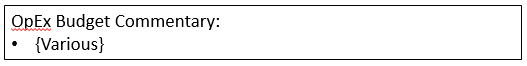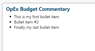 <div class="kpi-bar-widget-item" style="height:200px;width:865px;padding:5px 10px 5px 10px;border-radius: 6px 6px 6px 6px;border:1px solid gray;background-color:white;"><span class="kpi-bar-text1">OpEx Budget Commentary</span> <br/><span style="display:block;margin-top:5px;"><ul><li>