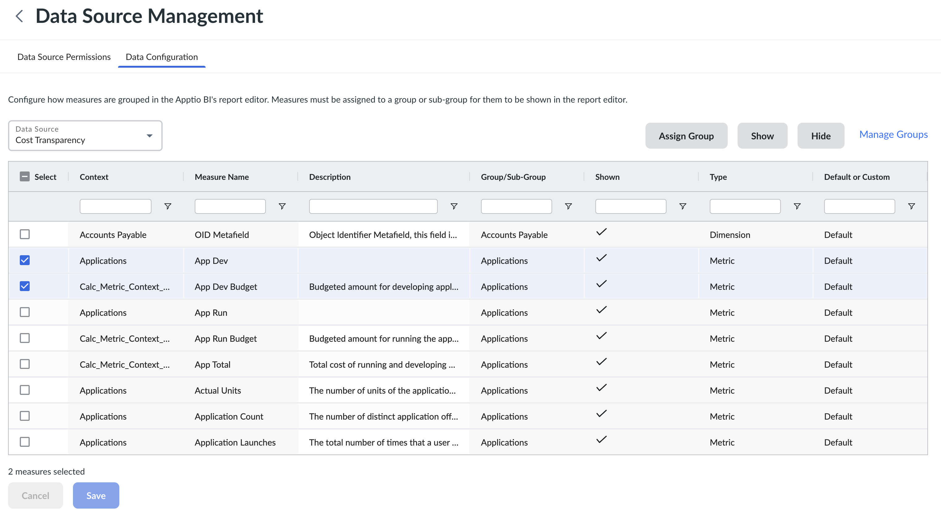 You need to go to the gear icon on the top right of the application and click into Data Source Management, which allows administrators to control the measures that are displayed as options to report on when creating visualizations (custom and default). Custom metrics (modelled or calculated) must be explicitly added to a group/subgroup to be exposed in Apptio BI. Let me know if you have any questions or need further assistance.