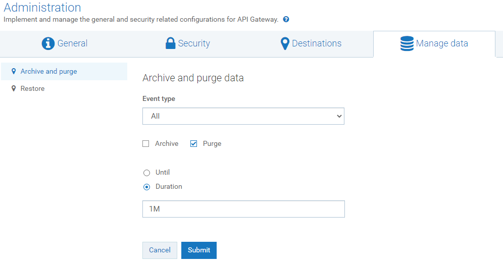 The rollover feature is not in this product release, yet. So I tried with a scheduled script which triggers a purge using the REST API (DELETE/rest/apigateway/apitransactions) - but that doesn’t seem to do anything. I then tried to purge using the UI (Administration > Manage data > Archive and purge), like this:
