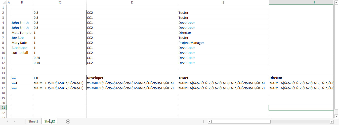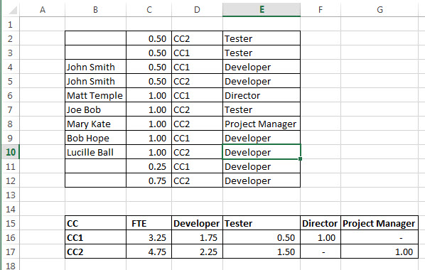 So this equation is saying that because the FTE (full time equivalent) for these people is 1, but there are two lines for that position, each of them are only .5 of a headcount (1 FTE/ 2 Positions). We thought about switching the denominator to sum Names instead of Positions to get headcount, but some of the budgeted positions didn't have people associated with them yet so they are blank. I guess we could put in "NEW POSITION 1", "NEW POSITION 2", etc if need be.
