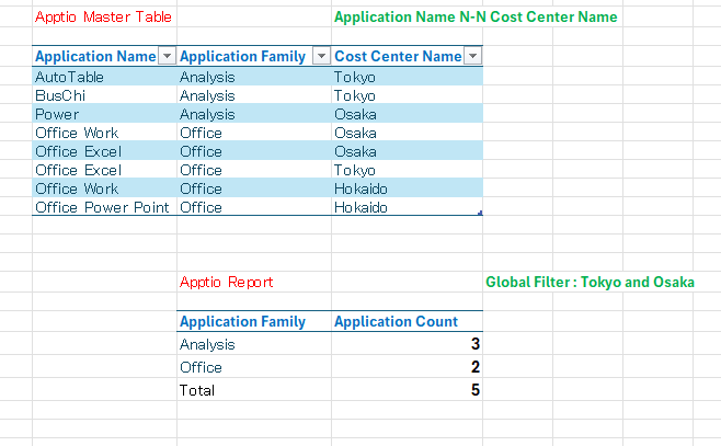 | I want to calculate Applcation Count(unique count Applcation Name) by Application Family, Filter condition is Cost Center Name = Tokyo and Osaka. The relationship between Application Name and Cost Center Name is many to many. Please help me. |