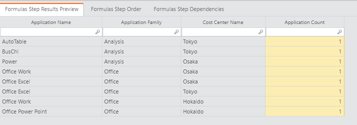 Case 1: add a column Application Count [Numeric] =1. Application Count Of Office =3 is Correct, not 5. Because i want count unique application.(Work, Excel, Power Point)