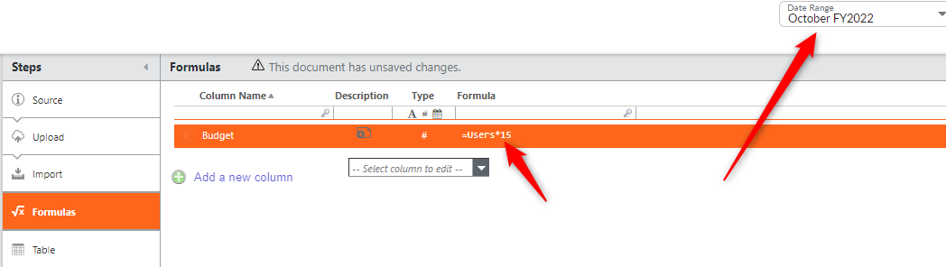 - I created a test table with a single upload and a formula step that calculates budget β= Users * 10:
