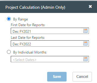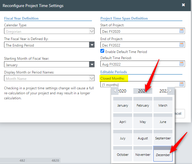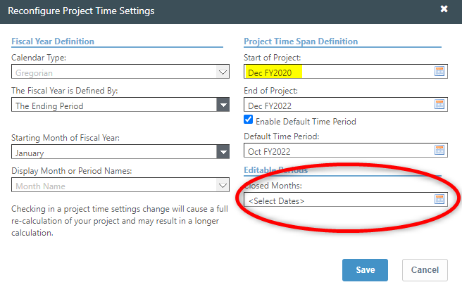 The Start of Project field controls the months that are online. You will not be able to select any period prior to that date: