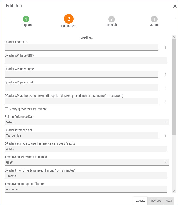 Regarding the configuration on ThreatConnect, first I create an API User and grant permissions. Then I create a new job, but when I go to the settings like picture below, I don't know if the QRadar API base URI is correct (and how to find it on QRadar). Therefore, I have not been able to push any indicator to QRadar yet.