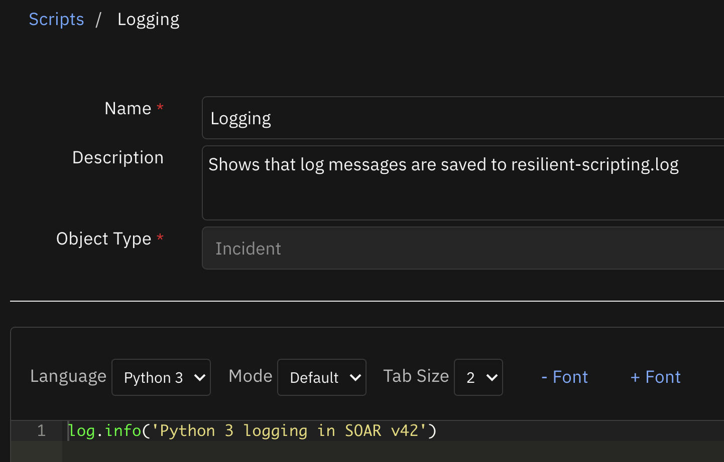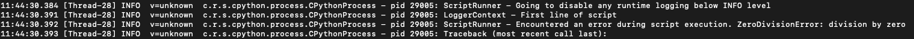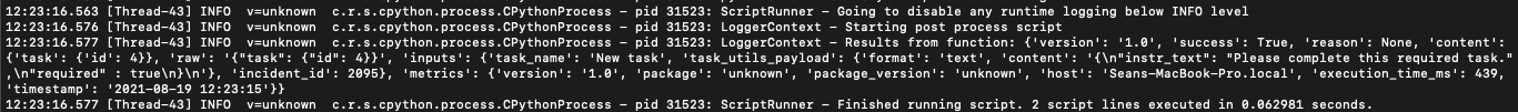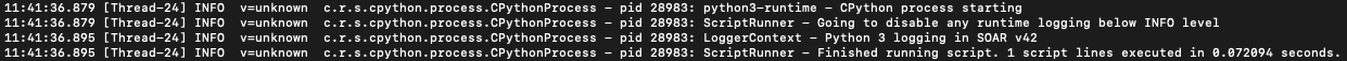 In previous versions, these log statements were only shown when interactively running a script. In v42 these log messages will also be written to the resilient-scripting.log file to help with debugging Python 3 scripts. The advantage of this is that you can view logs even when the script is run by an automated rule or playbook, and also view the logs of failed scripts.