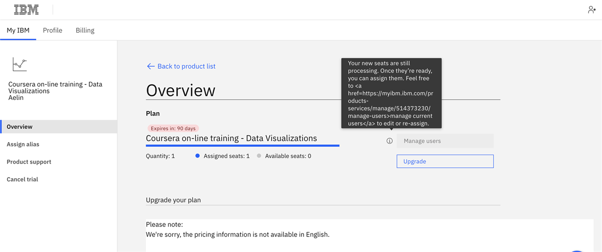 I recently enrolled for the Trial version of Cognos analytics on cloud for a course on Coursera on Digital Visualizations instructed by the module, but I am having issue with the launching process. As seen in the images I attached below, my trial expiration date is already in motion but I can't use the features I signed up for. It says the product is active but the launch button is unavailable. After clicking into the "Manage" page, the issue seems to be related to processing issues on assigned seats (it has been like this since yesterday).