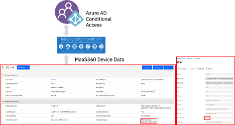 Using this new capability, administrators can now use MS Graph APIs to integrate with Azure AD Conditional Access Device Trust. This provides the ability to sync Device Trust information (isEnrolled, isCompliant) with Azure AD. Customers can then include and enforce MaaS360 activated devices into Azure AD Conditional Access rules.