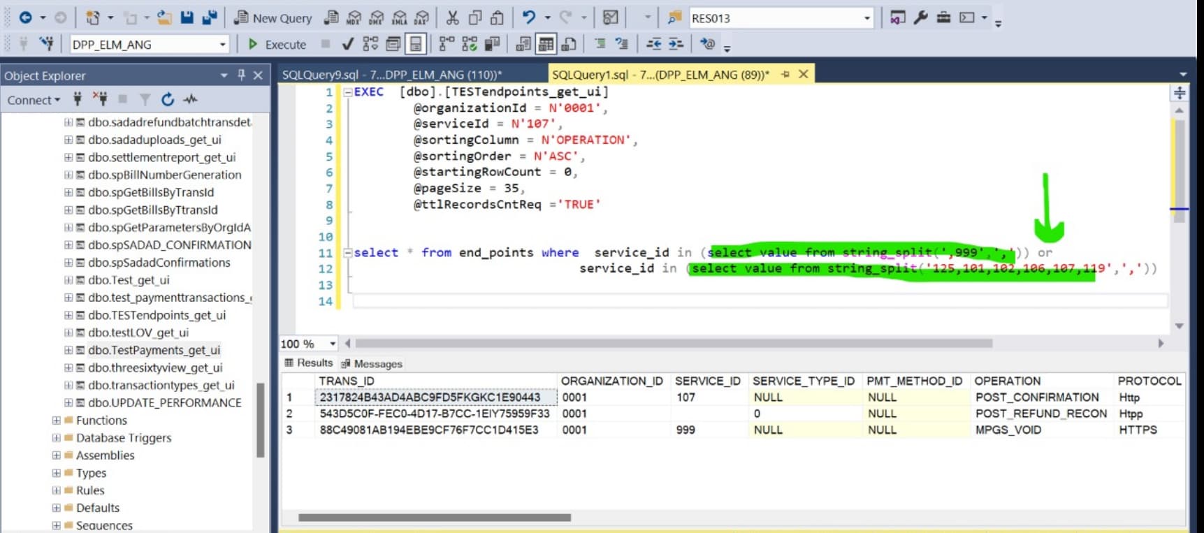 Actually i want to take any one condition in this while passing serviceID in SP. but this query giving me combining of this 2 stringSplit conditions select * from end_points where service_id in (select value from string_split(‘,999’,‘,’)) or service_id in (select value from string_split(‘125,101,102,106,107,119’,‘,’))
