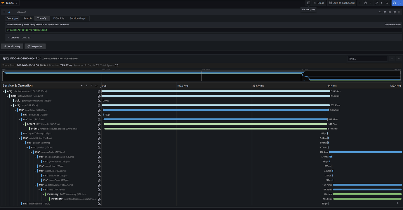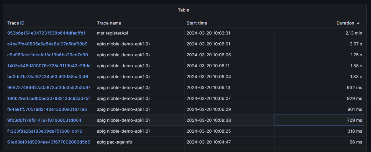 For example, here’s a screenshot from Grafana + Tempo showing a list of API’s and top-level services executed on webMethods sorted by Duration: