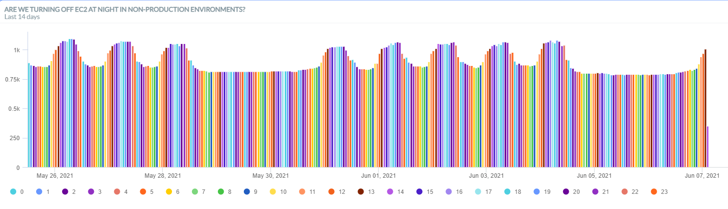 I'm not sure if this fits your use case, but I've attached a couple of images that illustrate this concept. In looking at the Rainbow Brite chart below, we would like to see a greater wave magnitude for compute resources which don't have a 24x7 requirement (production). This would illustrate good FinOps behavior of turning off resources when not in use. Each vertical hour represents a given hour of the day.
