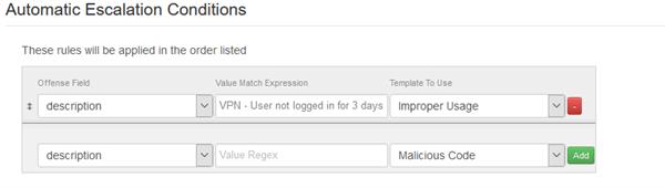 I want to escalate offense with description 'VPN - User not logged in for 3 days' automatically into Resilient from QRadar using below rule: