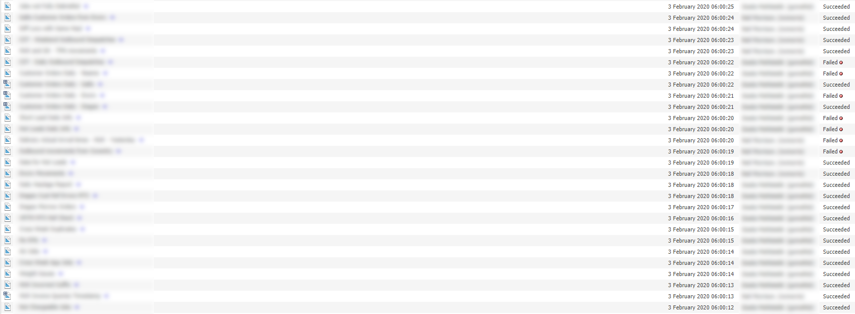 - Schedules are running fine before, between (in some cases), and after. The same reports that fail are running fine previous days also.
