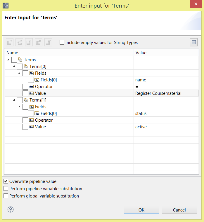 Ok, I fixed my previous error by using name instead of taskTypeID. This gave back the results I was looking for, but now when I try to search for name and status I get an error.