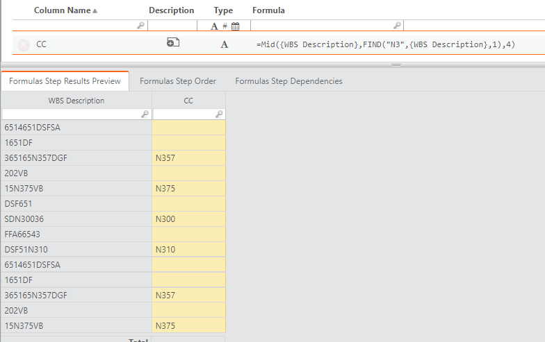 I'm trying to figure out how to pull specific data from an existing fiend in CT. I have an existing field (WBS Description) that has varying number of text characters in the field. Embedded in the text (in some cases) is a Cost Center code. I want the new field to be labeled "Cost Center" and I want it to scan the WBs Description filed and if it finds "N3" anywhere in the field I want it to return 4 characters starting with the "N3". So for example, it would return N352, N364, N312 (assuming it found "N3" in the WBS Description field). Thanks in advance for any help.