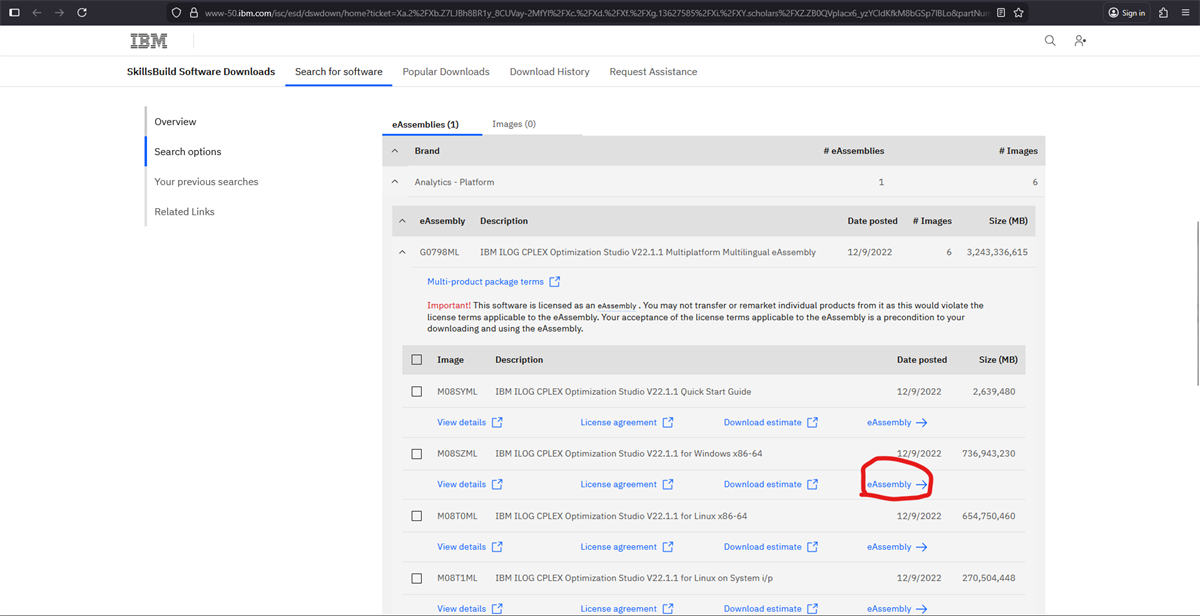 I am a PhD student and trying to download CPLEX Optimization Studio with academic license. First, I verified my student status and then it took me to a downloads page. The link was initially not working but I installed Firefox and it worked. When I clicked on the "Download" button of the software (see image 1), it redirected me to another webpage (see image 2). I clicked on the "eAssembly" button of the software in this page (see image 2), then it took me to another webpage (see image 3). I again clicked on the "eAssembly" button of the software in this page (see image 3) but nothing happens and I am not able to download the software. Please help me download the software.