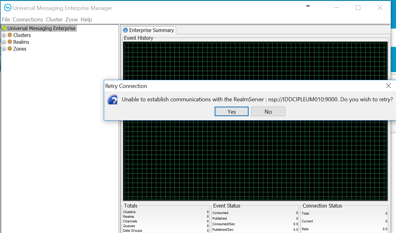 We have 3 UM servers installed in Linux server. Enterprise manager was installed in my desktop windows 10. I can connect to UM server using putty but when I want to connect using enterprise manager, there’s error : “Unable to establish communications with the Realm servers : nsp://idumserver010:9000. Do you wish to retry?”