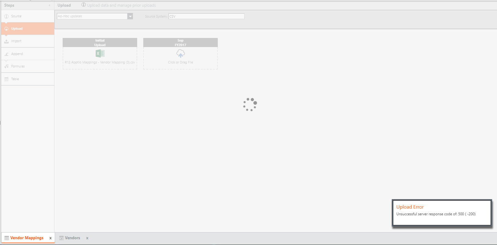 I'm having this error way too often. I'm fixing a mapping file so all the Vendor Model flow through and I have to be constantly uploading a new file but every now and then this error appears and I don't know what to do and after a while it gets back to normal.