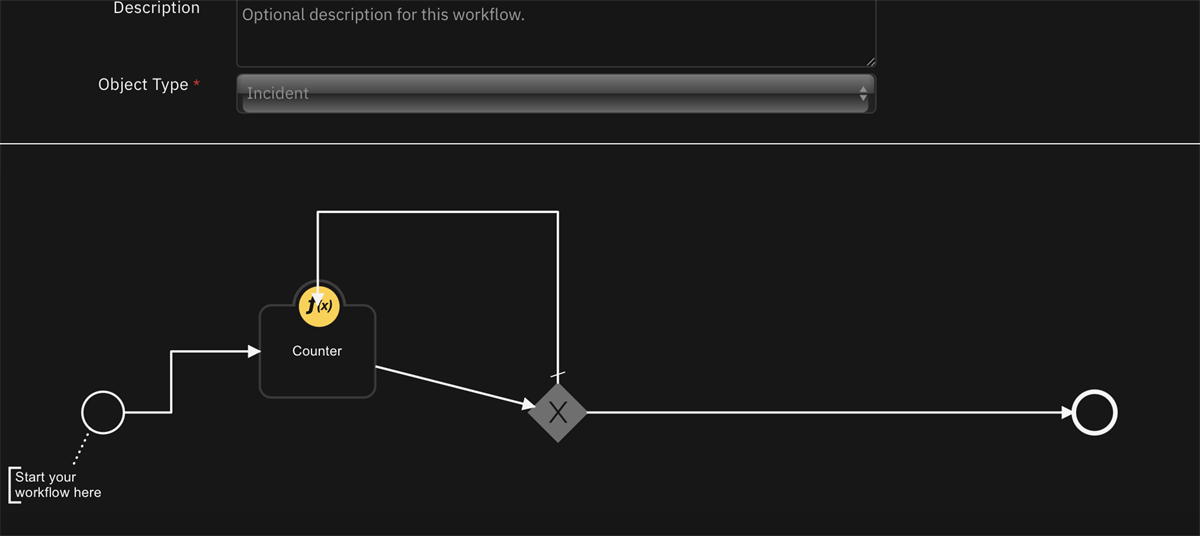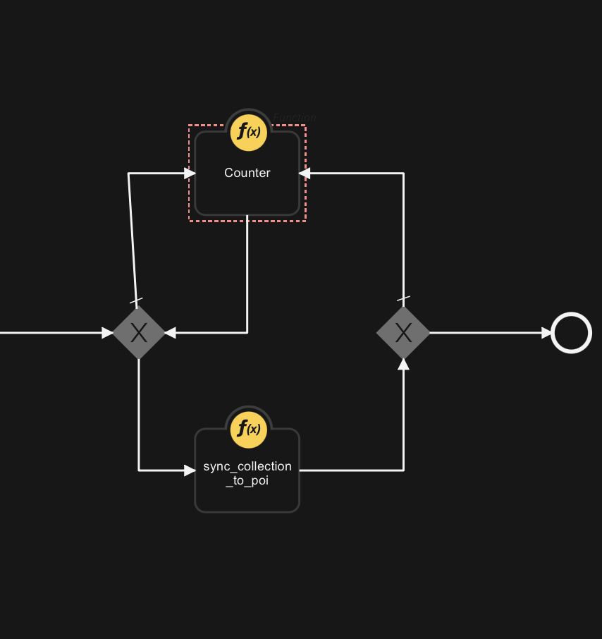 The workflow goes as: There's a sync function which syncs data between 2 tables and I counter over a row of table 1, so exclusive gateway checks if that row data exists in the table 2, and it only pass it to sync function if the data does not exist in table 2, and at the end when all rows are synced (Count == length of the table) the workflow ends