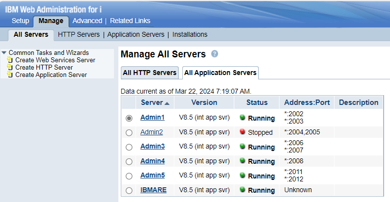 IBM Navigator for i (Old Web Interface) -> Application Servers, Admin2 -> ADMIN2