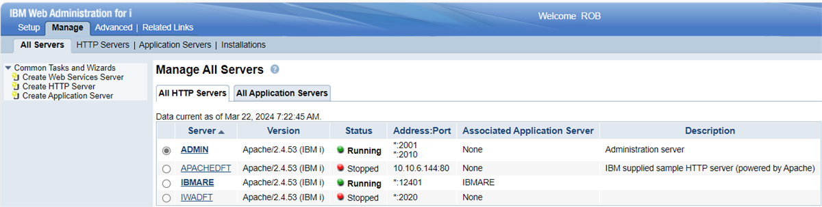 IBM Web Administration for i -> HTTP Servers, ADMIN -> ADMIN