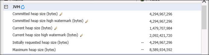 In the Cognos Administration and Security Guide there is "JVM Metrics" section that says there is "current heap size", "initial requested size", "maximum heap size", "up time" and "commited heap size".