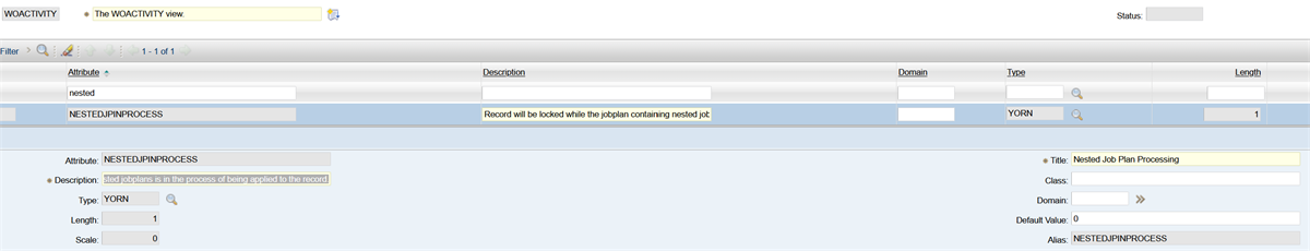 select DEFAULTVALUE from MAXATTRIBUTE where objectname in ('WOACTIVITY', 'WORKORDER') and attributename = 'NESTEDJPINPROCESS';