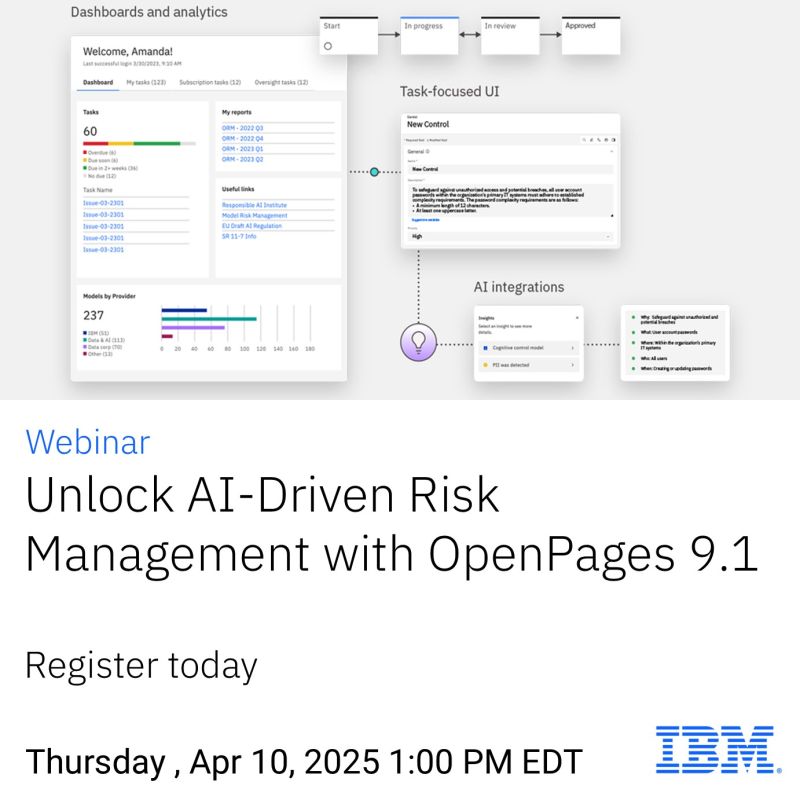 Join Nelson Pinochet, Principal Tech Sales Leader, IBM OpenPages, and Christophe Delaure, Principal Product Manager, IBM OpenPages, as they introduce the latest version of OpenPages, version 9.1. This webinar will cover the new features and enhancements that will take your risk and compliance management to the next level.