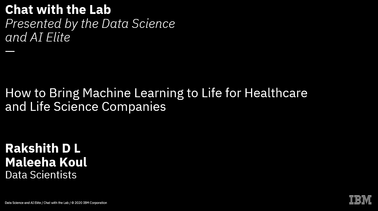 Join me and Rakshith as we discuss how the IBM Data Science and AI Elite team has worked with various Healthcare/Life science clients to help them address different use cases covering everything from staffing optimization to ensuring the AI models are unbiased. We will also talk about the various Machine Learning tools and techniques that the team used to build these solutions.