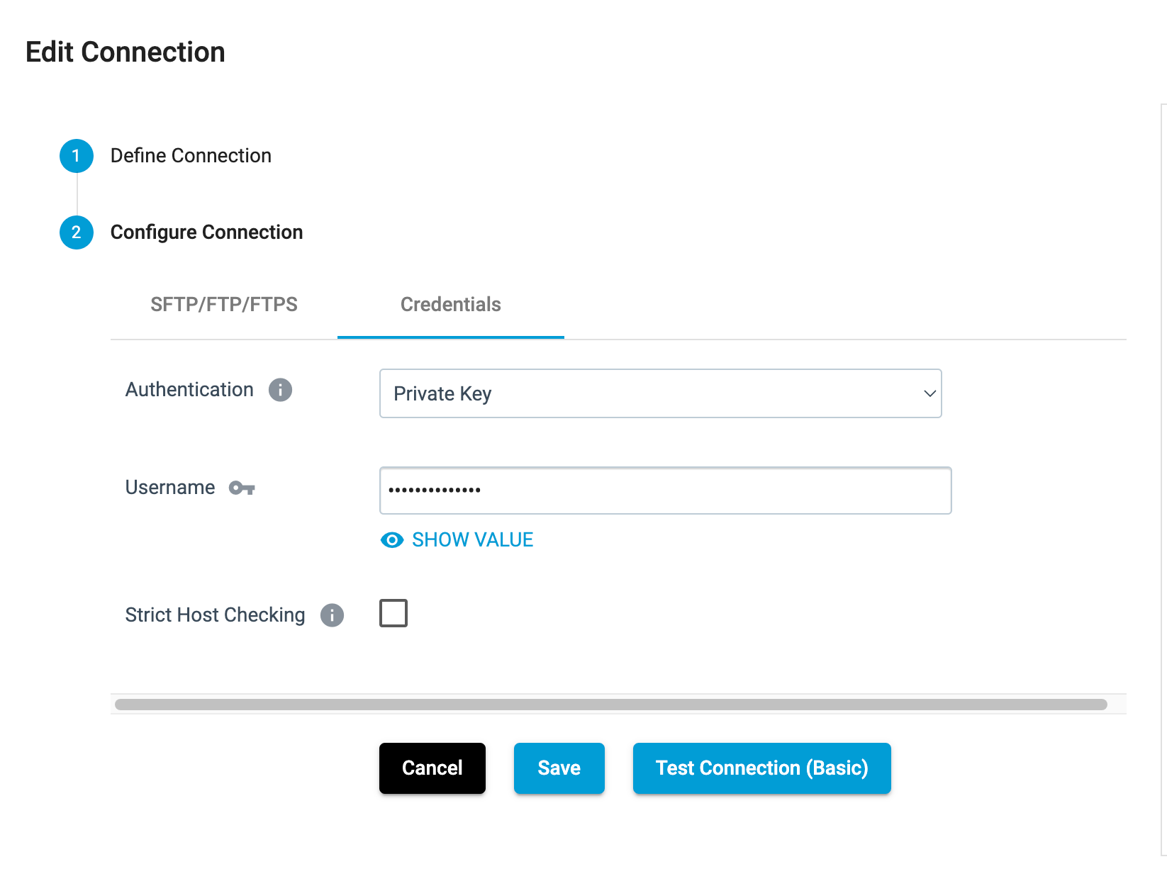 - Not use Connection for SFTP, and edit logon details directly in an SFTP stage in the pipeline, where you can provide the private key information.