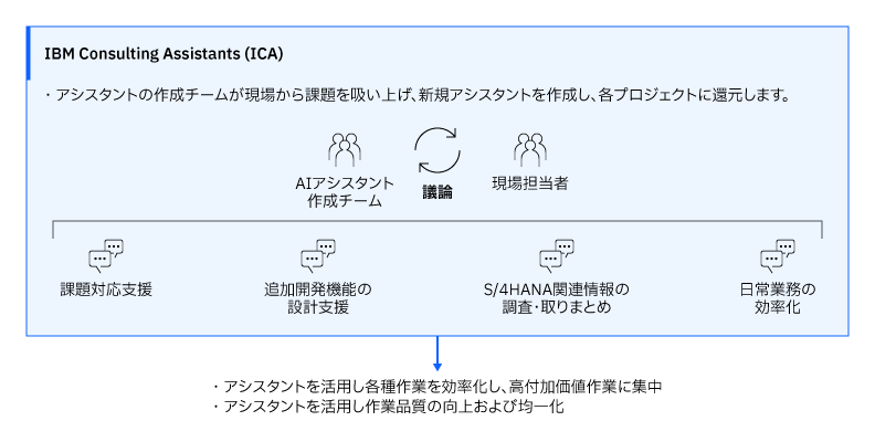 また、このようなAI活用を現場で確実に定着させるため、IBMではIBM Consulting Advantage [1][2]を基盤として活用しています(図1)。これはIBMが提供する「AI活用のためのプラットフォーム」です。このプラットフォームでは、プロンプトやデータを事前に読み込み、メンバーがすぐに利用できるAIアシスタントを公開できます。プロジェクト特有の標準やノウハウをAIアシスタントに組み込み、作業の実施やガイド準拠状況のチェックを自動化することで、AIがより的確に現場を支援できる環境を整えています。
