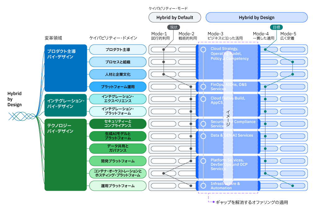 Hybrid by Designのケイパビリティー ・フレームワークを用いて現状 (As-Is) と目指す姿 (To-Be) を評価し、組織が抱えるギャップを明確にします。これらのギャップを埋め、変革を着実に成功に導く鍵 となるのが日本IBMのオファリングです。 IBMは、各ケイパビリティー ・ドメインにおける課題解決を支援するために、製品・サービス・ソリューションを組み合わせたオファリングを体系的に提供しています。ビジネスプロセスや人材、データ&AI、セキュリティ、IT運用高度化等、企業に必要なあらゆるケイパビリティーに対応する38のオファリングと将来の技術動向を見据えたテクノロジーで構成されています。