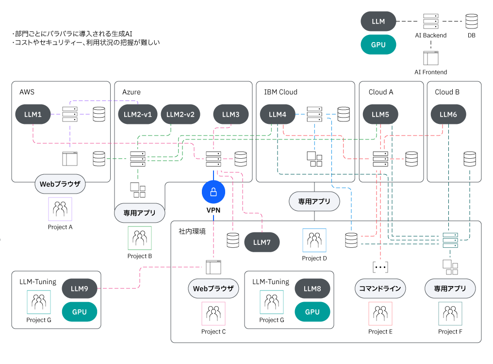 しかし、PoCが増えれば増えるほど、社内の環境は複雑化します。図1は、そうした状況を表しています。企業内では複数のプラットフォーム上にLLM (Large Language Models、大規模言語モデル) が配置され、それぞれのモデルを利用するアプリケーションも、Webブラウザ、専用アプリなど多様に存在しています。さらに、RAG (Retrieval-Augmented Generation) やチューニングに使うデータも部門ごとのデータベースやクラウド・ ストレージに分散しており、モデル・アプリ・データがそれぞれ独立して運用されており、全体最適化が難しいのが現状です。