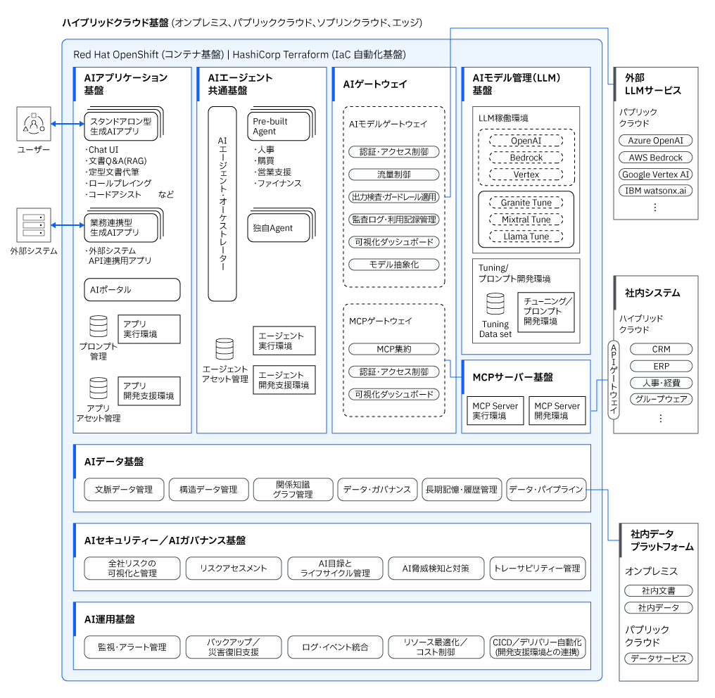 さらに、その下層にはAIセキュリティー/AIガバナンス基盤を配置。リスクアセスメント、トレーサビリティ、説明責任を実装し、AIの全ライフサイクルを通じて透明性を維持します。
