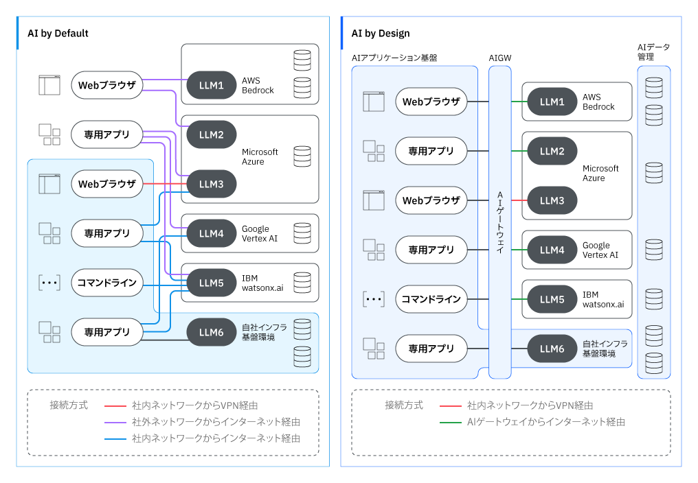 左側は、多くの企業が現在直面している「AI by Default」の状態です。アプリごとに個別にLLMへ接続しており、利用経路・認証方式・セキュリティー 基準がそれぞれ異なります。このため、誰がどのモデルをどのように利用しているのかを把握できず、モデルの切り替えやガバナンスの強化が困難になります。結果としてAI活用が属人化し、全社的な拡張や再利用が難しくなる構造です。