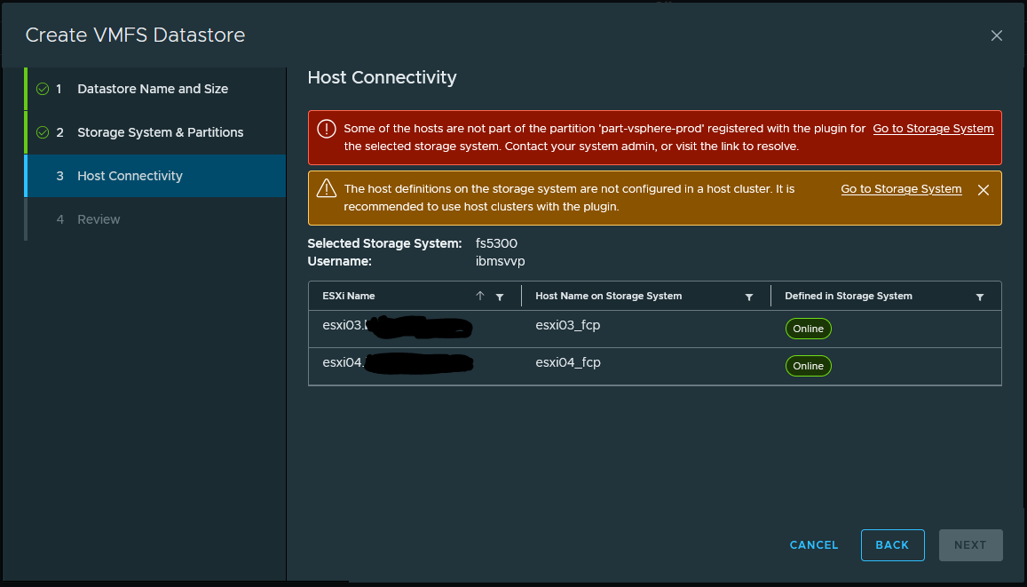Some of the hosts are not part of the partition 'part-vsphere-prod' registered with the plugin for the selected storage system. Contact your system admin, or visit the link to resolve.