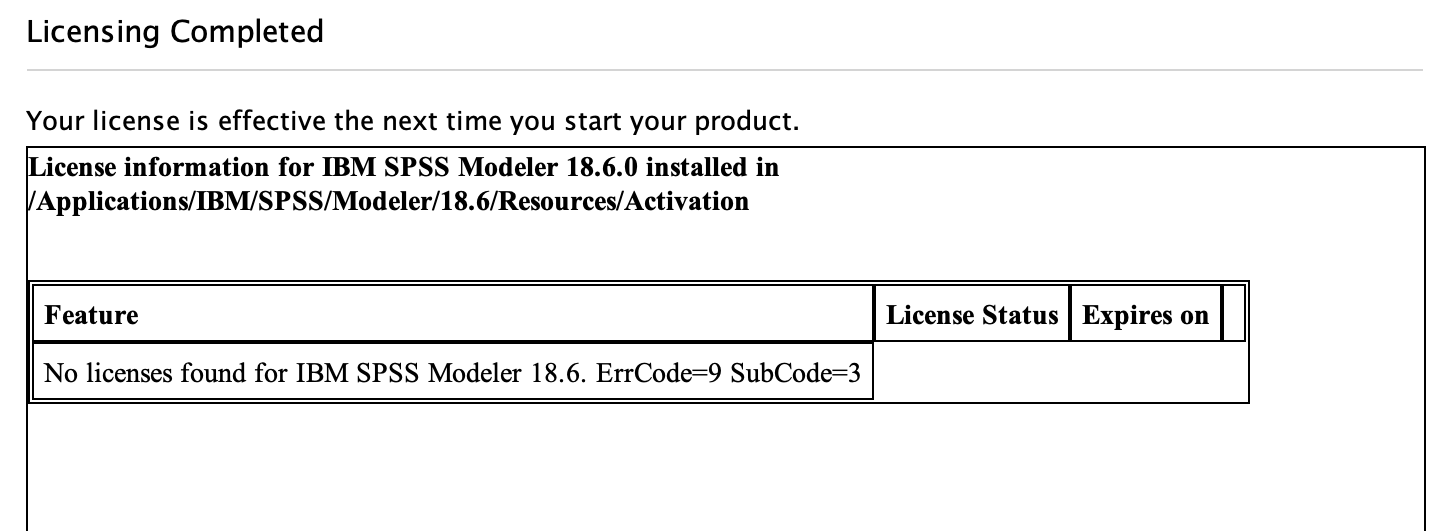 Hi, I need help with opening my SPSS Modeler Premium after being able to install it on my mac. I have a school license for college software downloads and have tried redownloading the software a couple of times. I was able to register the license through the license authorisation wizard but status of license being applied is unclear. It says that licensing is complete and it will be applied when I next use the product, but I am not sure if there is still a problem with the licensing because Modeler is unresponsive when I try to open it after installation. I have Modeler 18.6 and my MacOS is Sequoia 15.3.