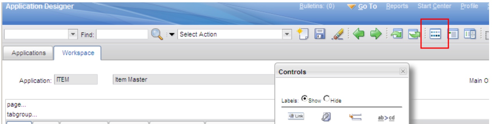 On the Workspace loaded with the Item Master application design open the Control Palette using the toolbar menu: