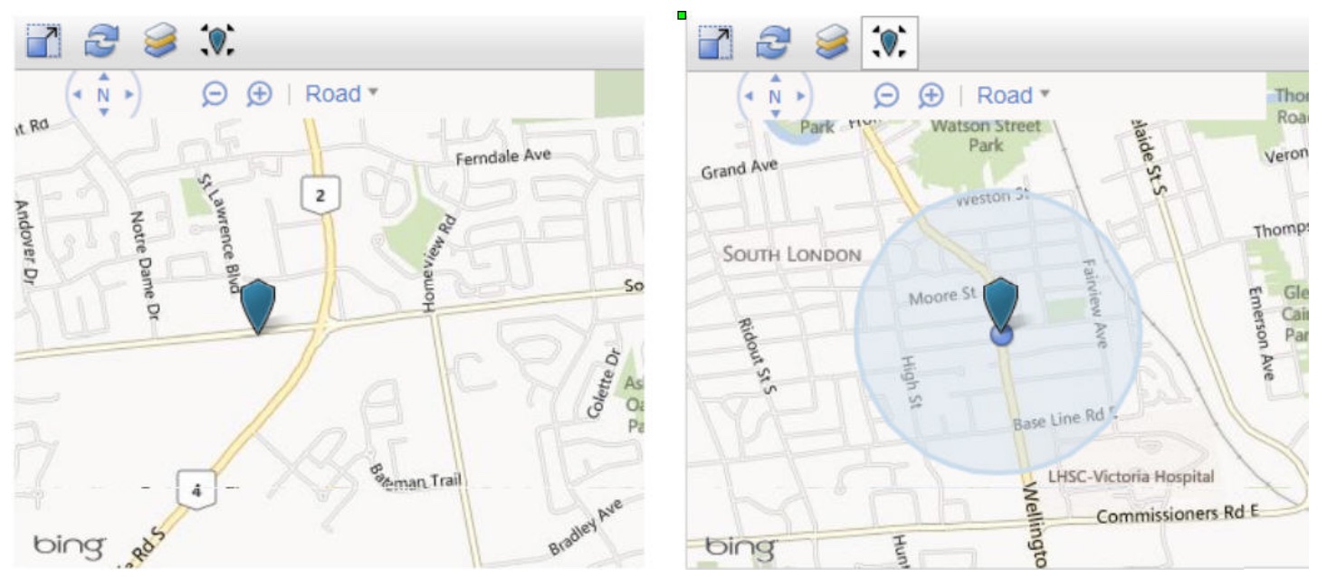 Figure 1: Example of a tool that toggles between the Asset's GIS location (to the left) and LBS location (to the right).