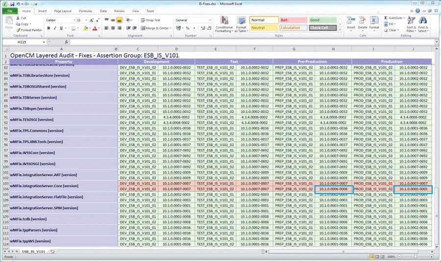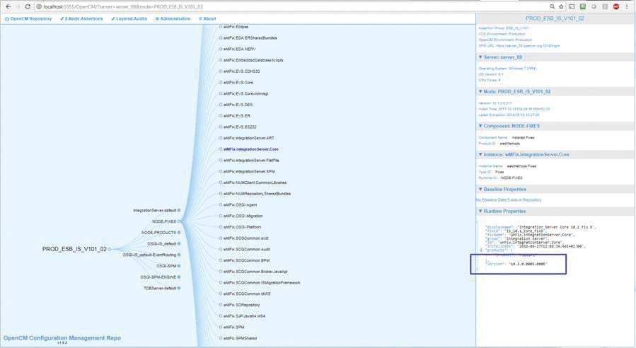OpenCM also comes with a user interface, allowing for easy navigation around your Digital Business Platform infrastructure landscape and providing the ability to easily drill down into detailed configuration item values. With a few clicks, one can swiftly see the current fix level of an IS in production, for example.