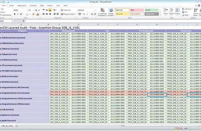 One of the comparison reports produced when performing assertions is an Excel® spreadsheet that shows values for every installation across multiple environments. When a row is colored red, it means that one of the values (or multiple values) for the particular property is different when they in reality should have been the same.