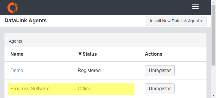 In your Datalink Agents menu, the Agent is listed with the Status of Offline.