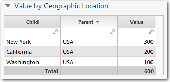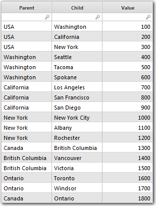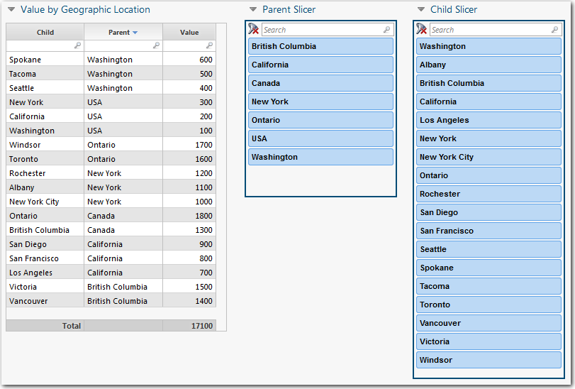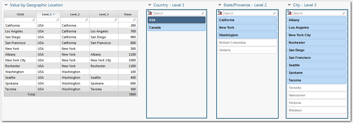 But what if you want the users to be able to see all of the entries associated with USA? You can achieve this by "flattening" the hierarchy using the Flatten Hierarchy feature. The Flatten Hierarchy feature takes the information in a parent column and a child column and adds "level" columns that can be used with slicers. The result is shown below. By flattening the hierarchy, you provide users with the maximum flexibility when using slicers.