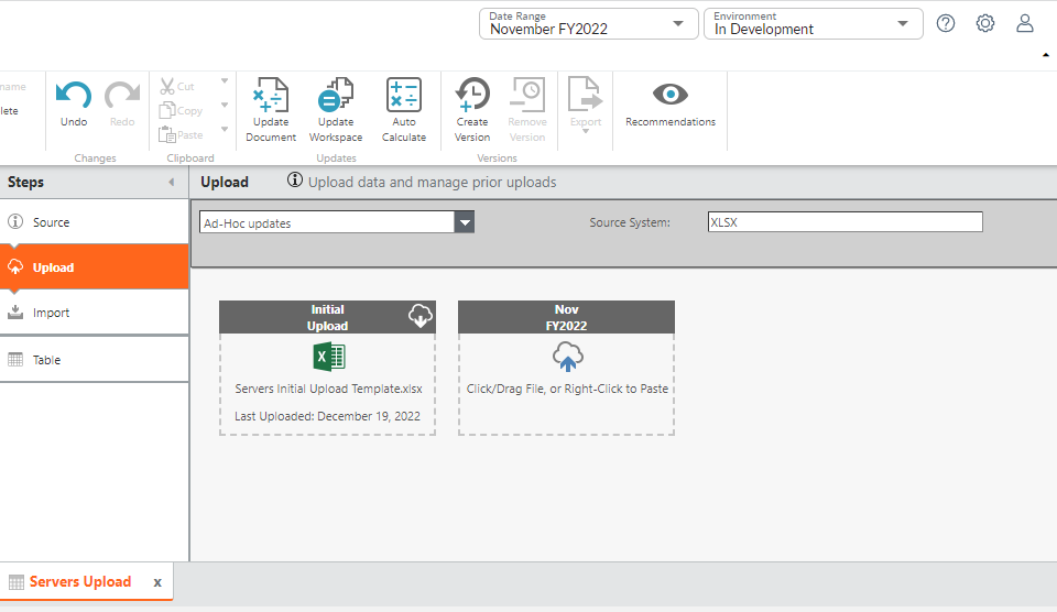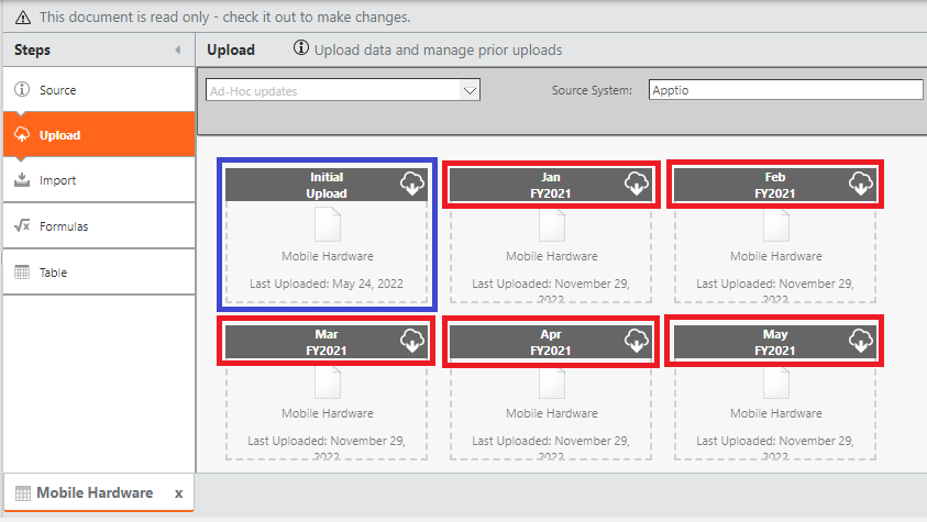 When a table in TBM Studio has been created and its ‘Source’ set as ‘File Upload’, the user will be presented with an option and a space in which to make an ‘Initial Upload’, along with an upload space for each time-period, assuming that the Data Refresh Cycle has been set to ‘Ad-Hoc updates’.