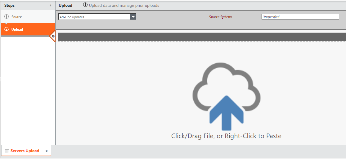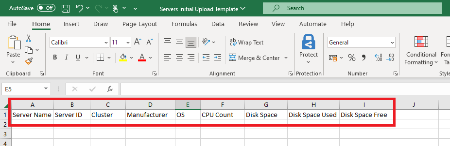 Whilst it is perfectly possible to upload a full data set into the Initial Upload, it is Apptio’s guidance that the user uploads a ‘Template’ instead. In this case the template is simply the column headers without any of the column data. Please see the example below for a basic ‘Servers’ file (this example is just to demonstrate the concept; it is not necessarily representative of a servers data set).