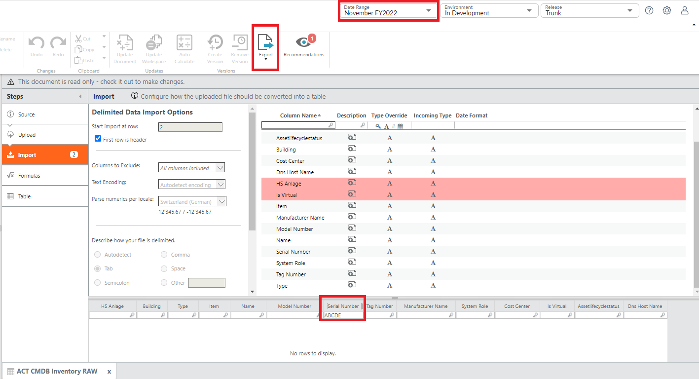 Typing ‘ABCDE’ (or anything else that will not return a result) into the Serial Number successfully filtered all the rows. Then a simple Export of the data will create a file with just the column headers that can be uploaded into the Initial Upload.