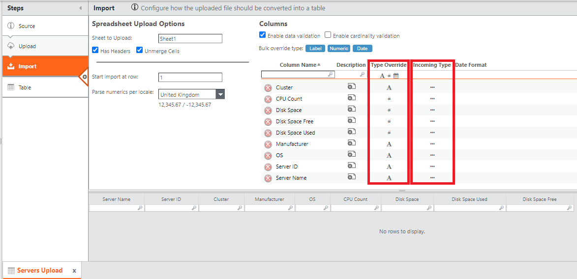 Another key benefit obtained from using a template is when the table is going to be used specifically to conjoin several other tables using the Append function. A template means that the column headers are already established for the Append function to automatically match the incoming columns to, however it won’t do this unless you select the Column Type in the Import step. The example below shows that the ‘Incoming Type’ is not recognised, which is to be expected given the lack of data, and the ability to over-ride that selection.